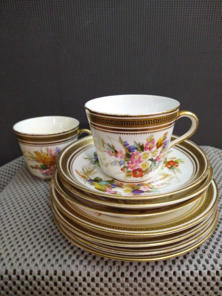 - Collectibles & Art > Antiques > Antique Porcelain Gold Rim Floral 2 Tea Cups 3 Saucers 4 Plates Antiques