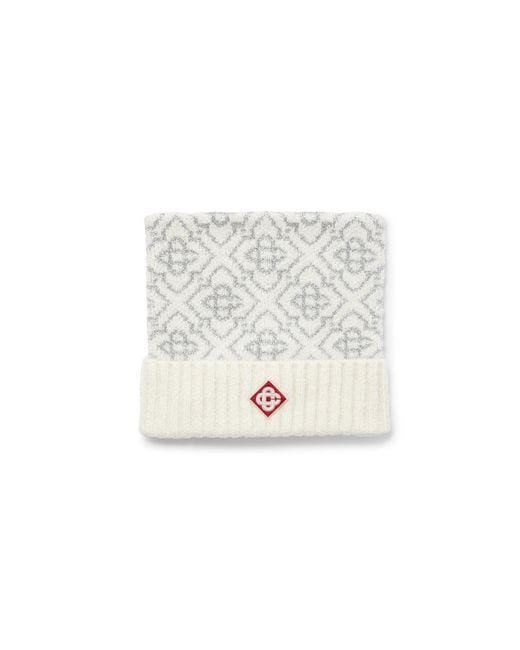 | Characteristics of goods | Mohair mix fabric Composition: 25% polyamide, 21% viscose, 18% cotton, 14% wool, 13% mohair, 9% polyester Colour: white/grey monogram Specialised dry clean only Made in China The model is 190cm / 6'3 Exclusive to casablancaparis Color: white Product details: The ski beanie is a refined design crafted from mohair fabric featuring the house's white and gray monogram motif, inspired by frost patterns on traditional Japanese farmhouse windows. Drawing from snow crystals on bamboo groves, the design embodies après-sport elegance. | ||